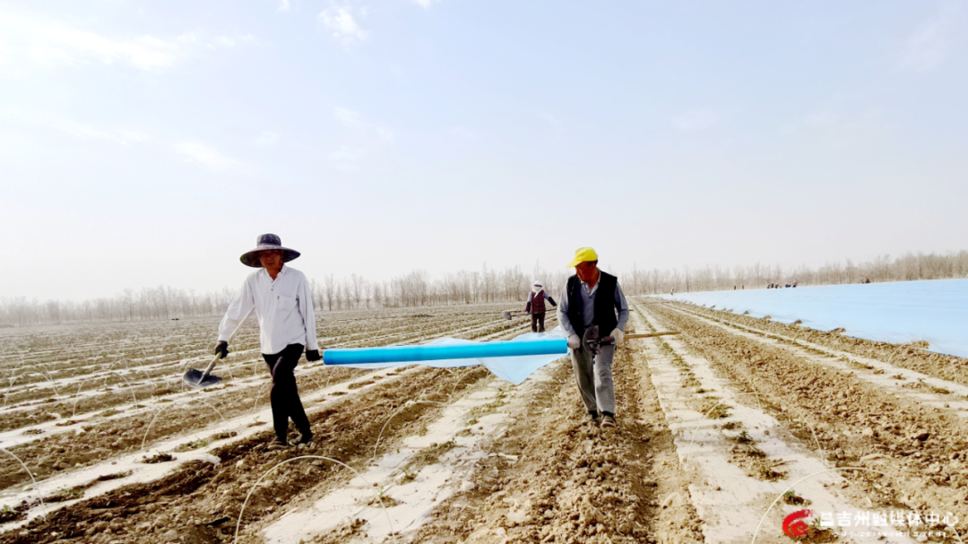 瓜农们正在压实地膜、移栽西瓜苗。记者王薇 摄