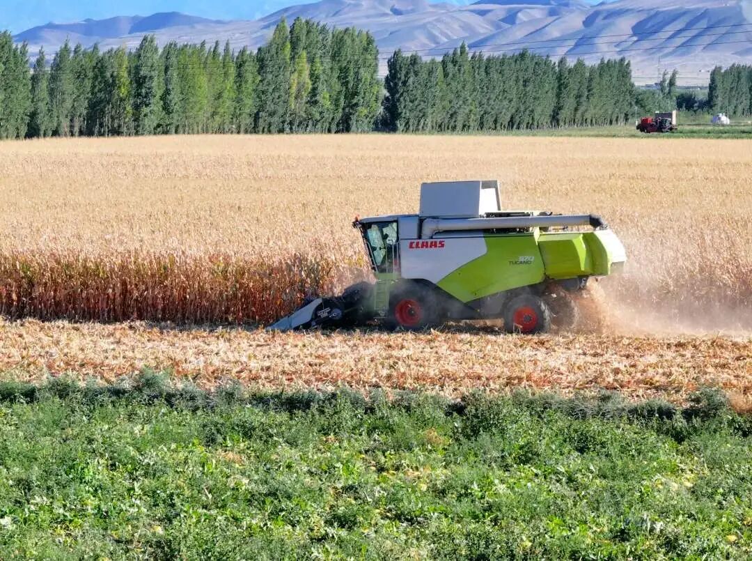 9月11日,在吉木萨尔县老台乡老湖村,大型收割机正在收获玉米。通讯员冯晓阳 摄
