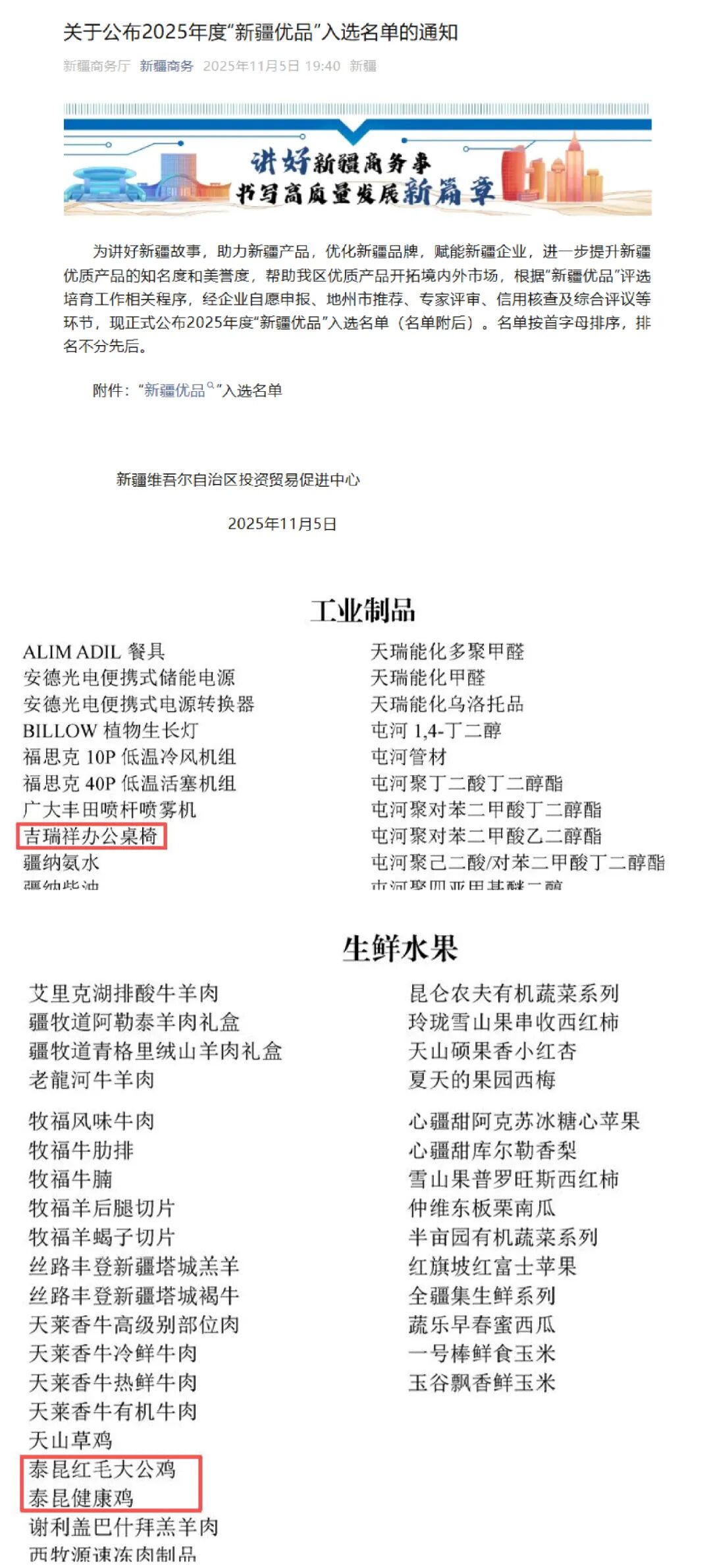近日,自治区商务厅正式公布首批“新疆优品”名单,昌吉州凭借扎实的产业基础与过硬的产品品质,共有31家企业5大类、80余种优质产品成功入选。其中,新疆瑞祥智能制造股份有限公司的办公桌椅,以及新疆泰昆集团有限责任公司的红毛大公鸡、健康鸡等代表性产品,以卓越品质通过严格遴选,斩获官方权威认可,成为昌吉州优质产品走向更广市场的闪亮名片。