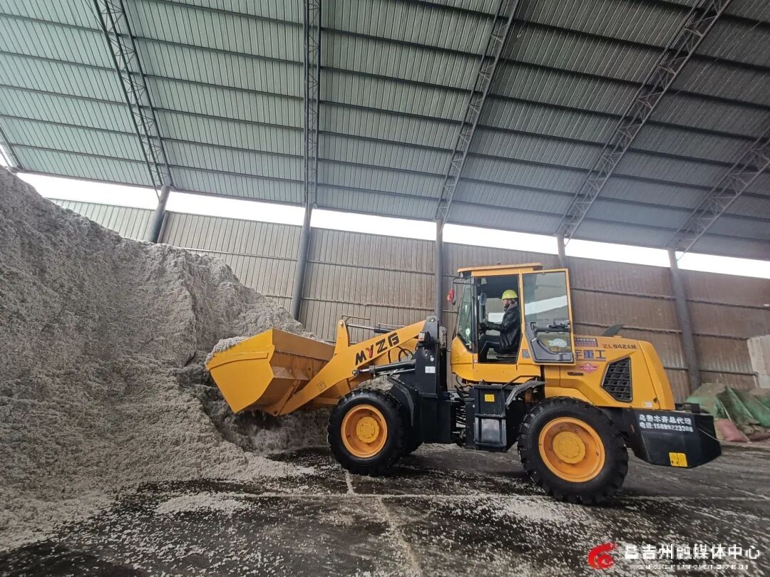 泰昆昌吉蛋白生产车间里,员工驾驶铲车,将毛棉籽装进加工车斗进行脱绒。记者刘茜 摄