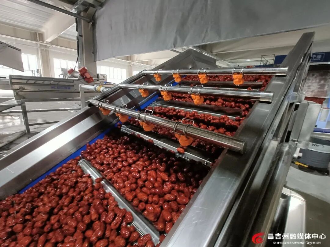 1月27日,昌吉国家农高区榆泉现代农业产业示范园区内,新疆绿谷数智食品产业园的生产车间里,机器轰鸣、产销两旺。自动化生产线高速运转,一颗颗新疆本地优质红枣经高压喷淋清洗、智能筛选、高精度分级色选等工序,变身标准化成品整装待发,即将运往全国各地市场。
