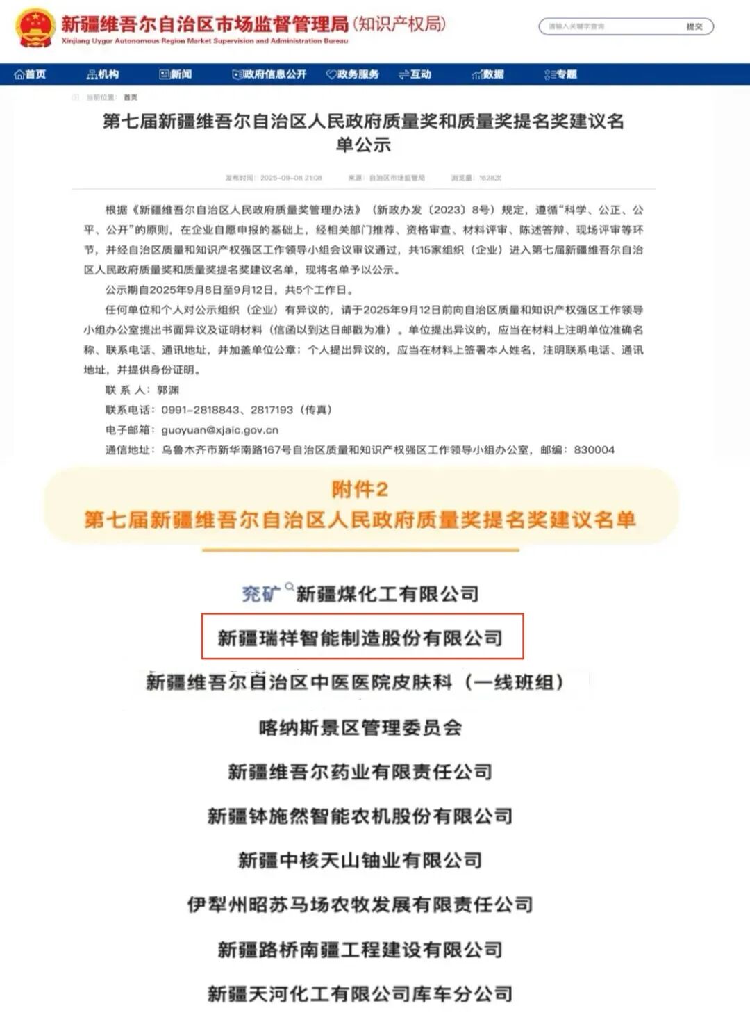 近日,第七届新疆维吾尔自治区人民政府质量奖和质量奖提名奖名单公布,昌吉国家农高区企业--新疆瑞祥智能制造股份有限公司荣膺“第七届新疆维吾尔自治区人民政府质量奖提名奖”。