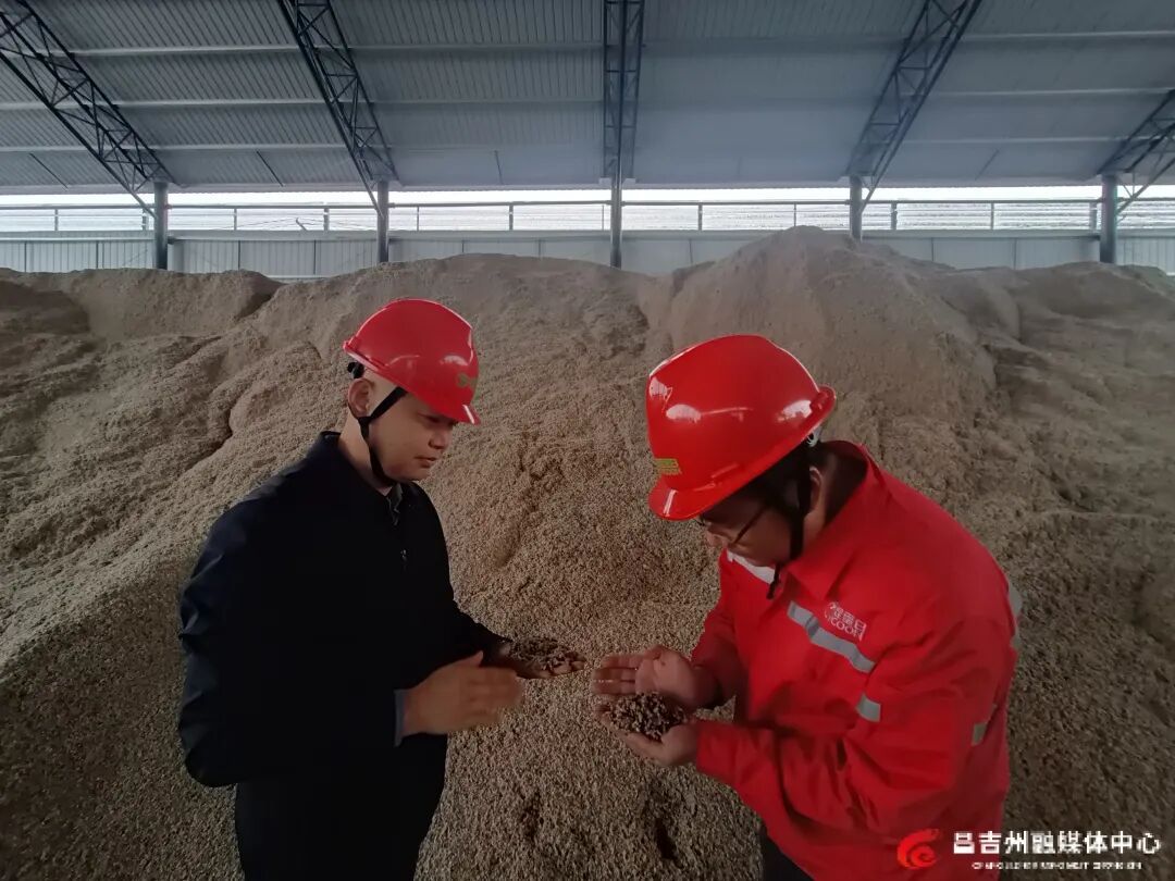 11月6日,泰昆昌吉蛋白总经理甘丛贵(左)在厂区检查产品质量。 记者刘茜 摄